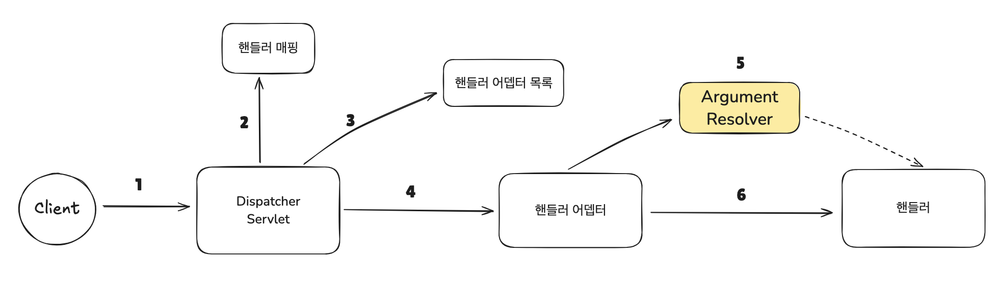 이처럼 ArgumentResolver는 HandlerAdapter 내부에서 컨트롤러 메서드의 각 파라미터를 해석하고 값을 주입하는 역할을 담당한다. 핸들러 매핑과 핸들러 어댑터는 컨트롤러를 찾고 실행하는 큰 틀을 담당하고, ArgumentResolver는 그 안에서 파라미터 바인딩이라는 세부적인 역할을 맡는다고 볼 수 있다.