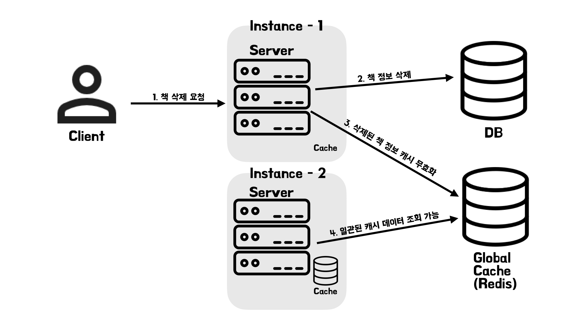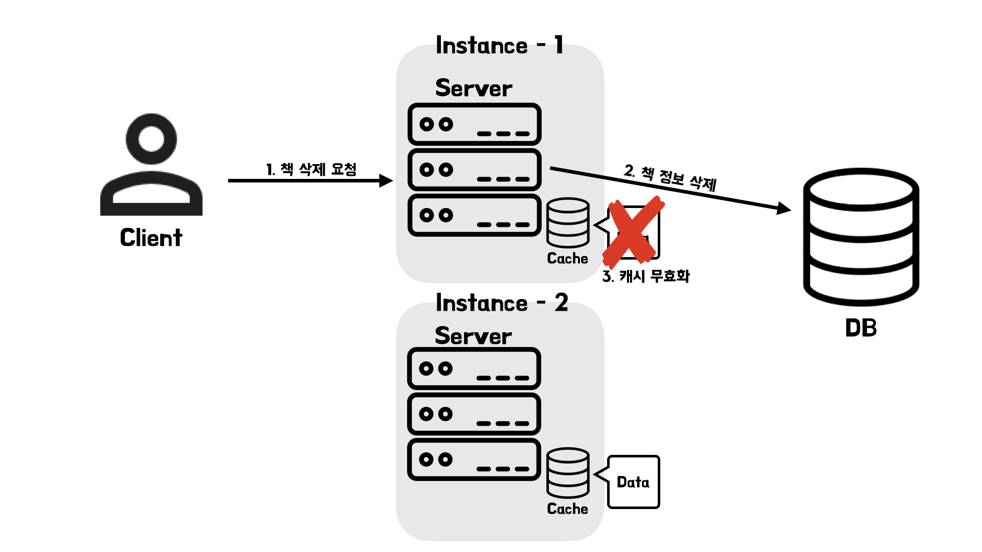 일관성 문제 발생 예시 분산 환경에서 로컬 캐시를 사용할 경우, 각 인스턴스는 자신의 메모리에 독립적으로 캐시를 유지한다. 따라서 Instance-1에서 책 삭제 요청이 처리되어 해당 인스턴스의 캐시가 무효화되더라도, Instance-2는 이 변경 사실을 알지 못하고 여전히 삭제된 책의 정보를 캐시에 보관하게 됩니다.